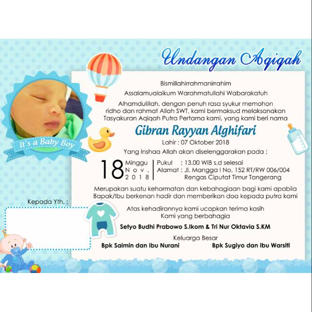 Ucapan bayi lahir terbaru · kumpulan bingkai undangan aqiqah lucu terbaru. Aqiaqh syafaat 1,2an (promo), gratis ongkir! Contoh surat undangan tahlil 40, 100, 1000 hari (haul).doc microsoft. 30 kartu ucapan pernikahan download background template . Ucapkan harapan dan doa untuk buah hati sahabat melalui 50+ layout kartu ucapan kelahiran bayi yang mudah diedit di canva.