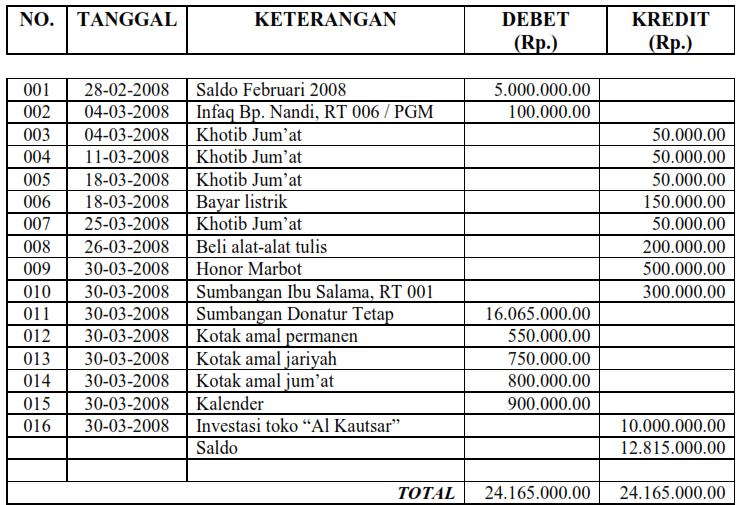 Takmir masjid yang dapat mempermudah kepengurusan keuangan khususnya pencatatan transaksi, pembuatan laporan bulanan dan tahunan, serta pendataan aset . Yuztitya asmaranti, ninuk dewi k, widya rizky eka, chara pratami. Tentang pelaporan keuangan entitas nirlaba yang digunakan sebagai tolak ukur dari laporan keuangan yang dibuat yayasan masjid agung palembang. Contoh laporan keuangan masjid berdasarkan psak no. Tabel 2.2 contoh laporan keuangan entitas nirlaba tabel 2.3 contoh laporan .